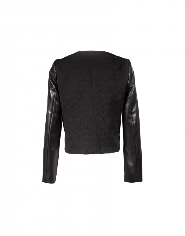 Short black jacket in embossed fabric with faux-leather pockets and sleeves. Casual/Urban wear.
