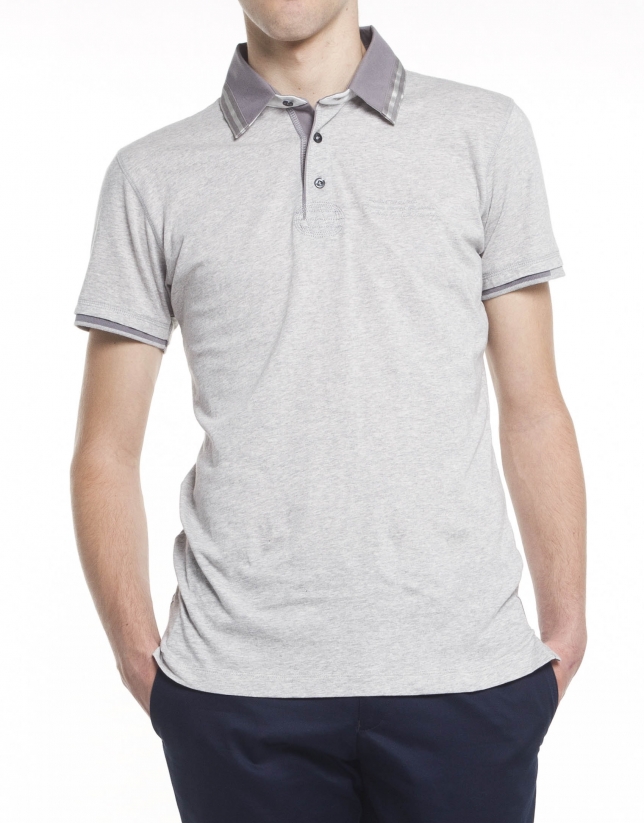 Grey polo shirt with contrasting collar and sleeves, embroidery on the chest and a flap.
