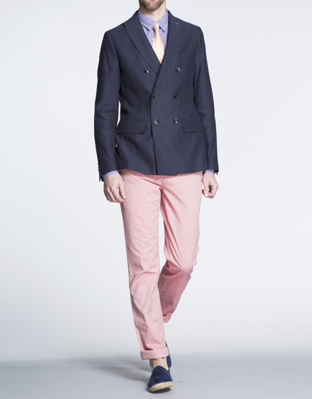 Blue structured, double breasted jacket with one breast and two wallet. Stitching around V neck.