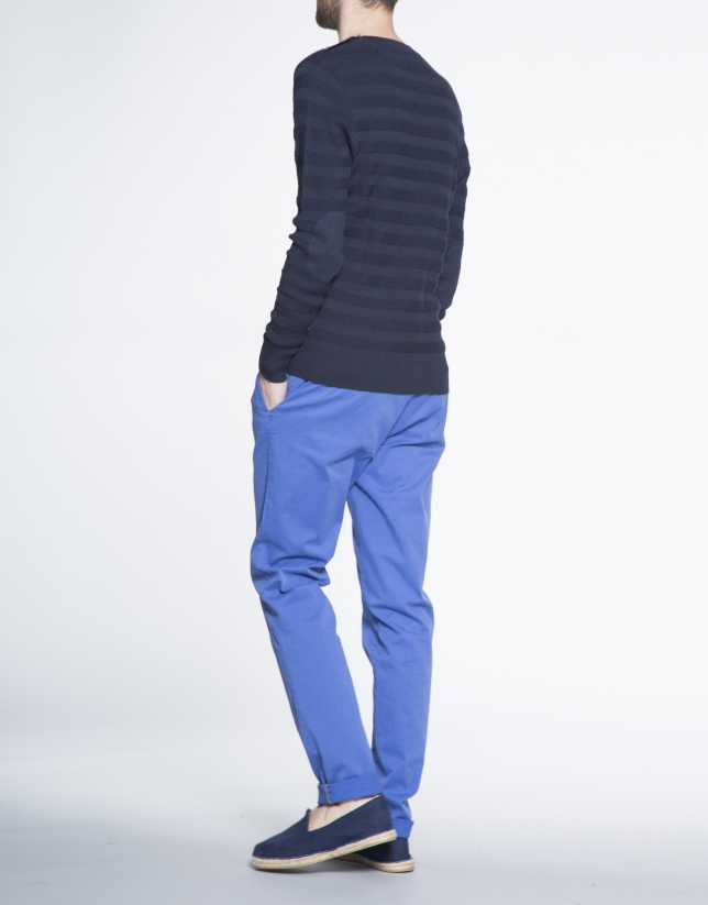 Navy blue structured sweater with bare shoulders and buttons and ribbed cuffs, collar and waistband.