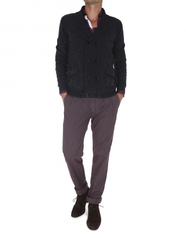 Gray double breasted V neck sweater with eight buttons in front, tuxedo collar and two patch waist pockets with ribbed collar, panel, waist and cuffs.