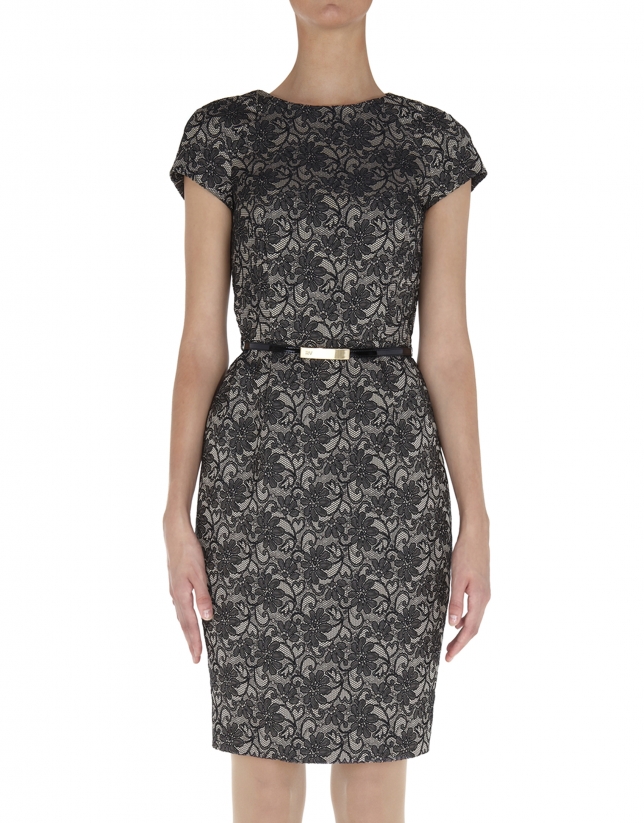 Black straight short sleeved dress with floral cloqué print at bottom, back zipper and matching belt and lining.