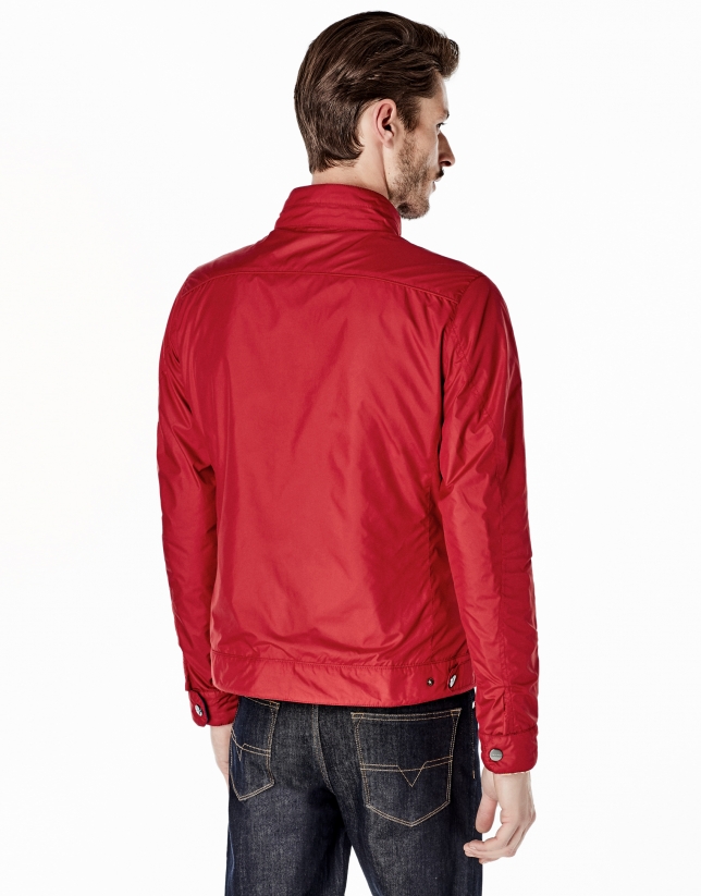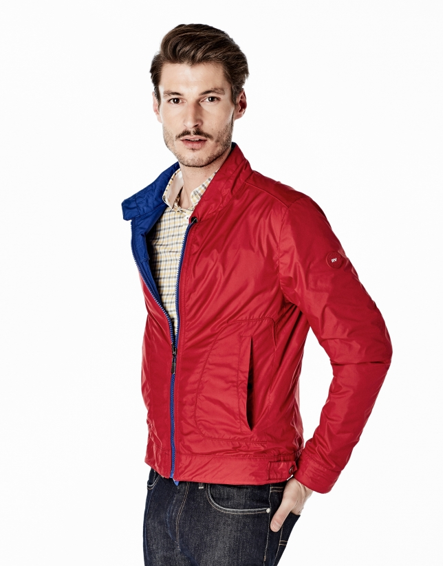 Reversible windbreaker with red on one side and blue squares on the other, two side pockets on the red side and two zippered breast pockets on the blue side, front zipper and clasp on collar.