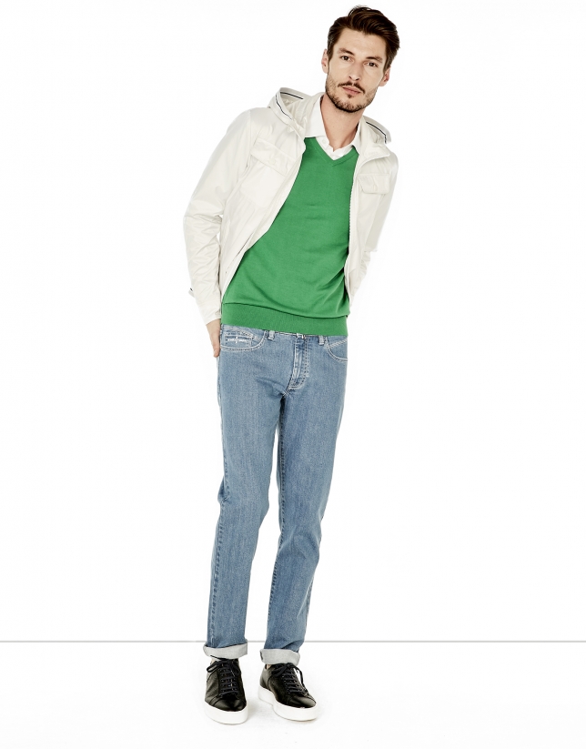 Stone-colored parka with removable hood, with white bands on collar and cuffs, front zipper and two side pockets in front and two flap breast pockets. Clasp on cuffs.