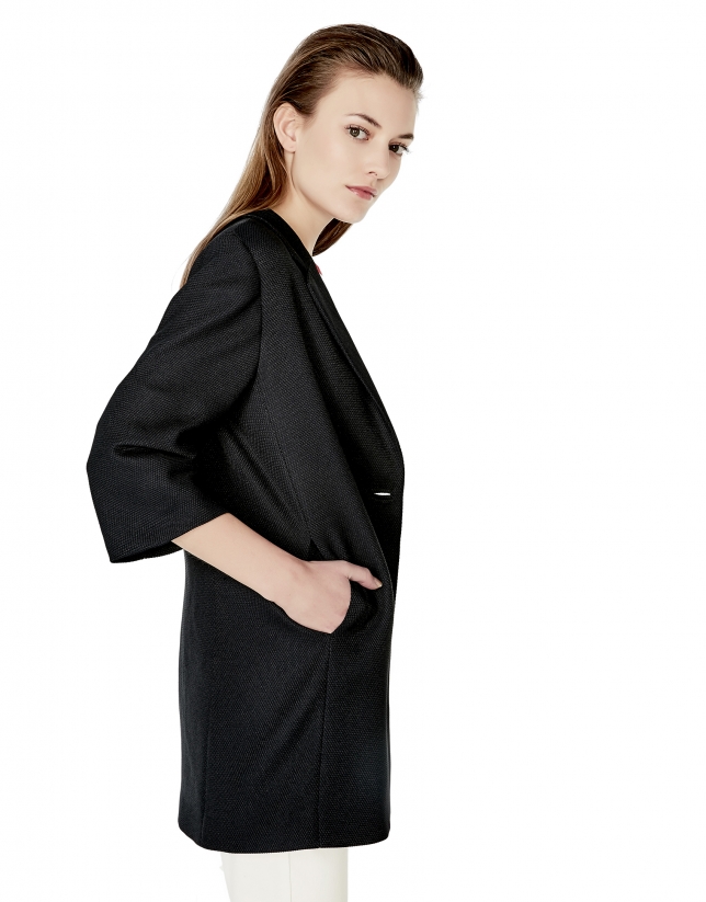 Blue short coat with straight cut, lapel collar, long sleeves, two side pockets and one front button.