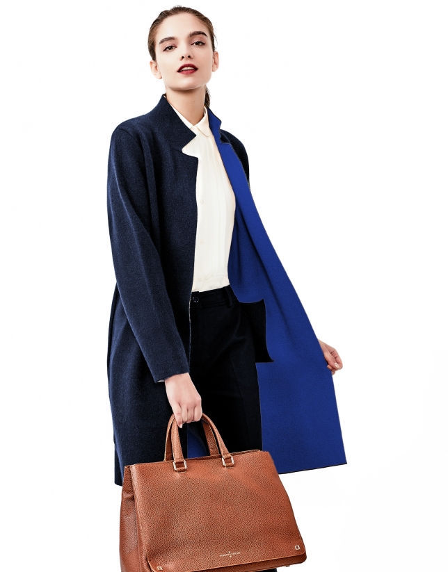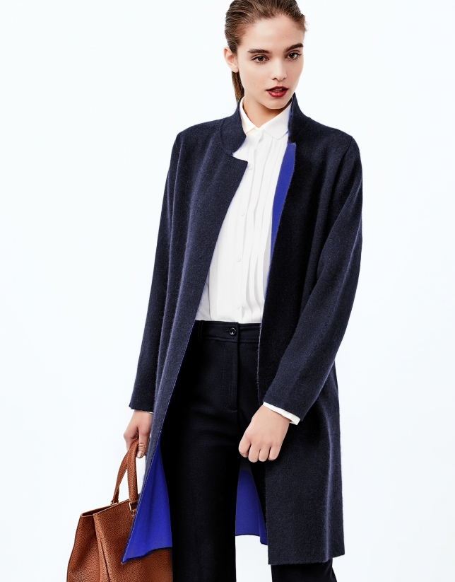 Blue long, double-faced knit coat, with straight cut, open in front, Mao collar, long sleeves, two side pockets and slits.