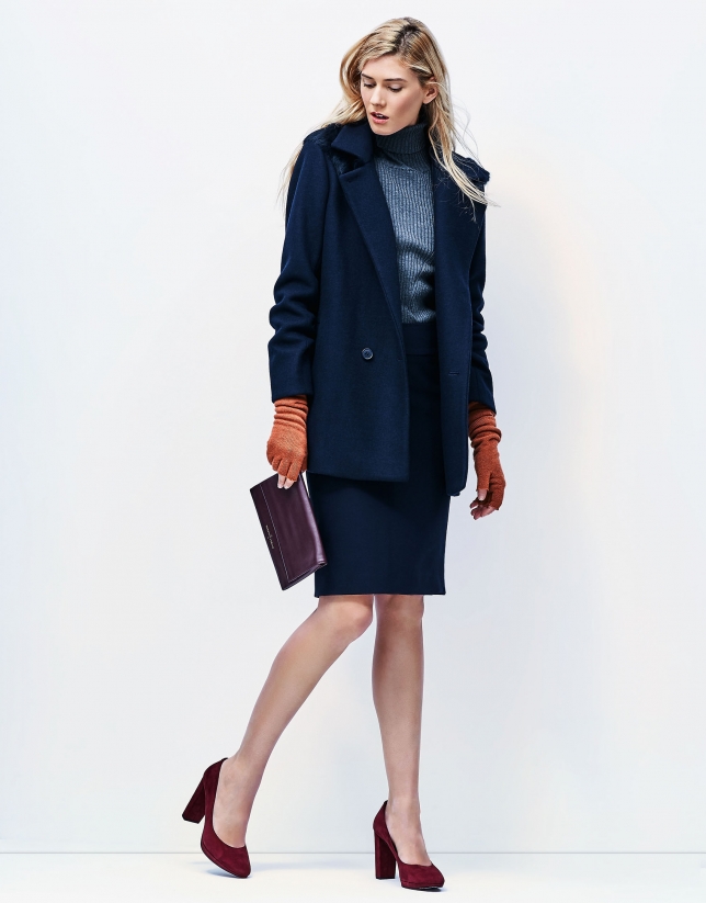 Blue three quarter jacket with detachable hood, made from rabbit fur, straight cut, long sleeves, two side pockets and two button closure in front.