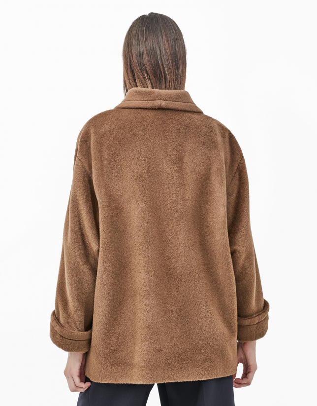 Short, straight brown coat with funnel neck, long turned up sleeves, two side pockets and two clasps in front.