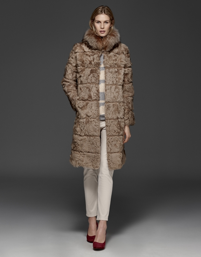 Dark brown lambskin coat with two different lengths creating horizontal bands, fox collar and furrier snaps.