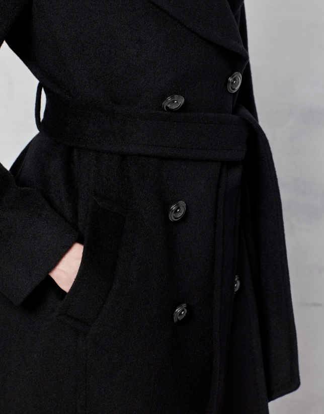 Black wool and angora double-breasted coat with belt