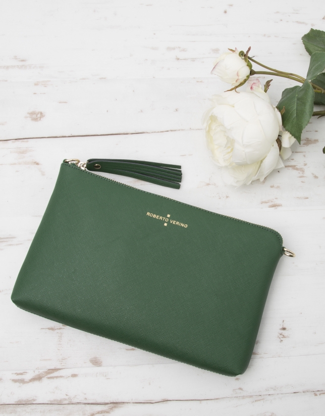 Women's green Saffiano leather messenger bag with zipper, matching leather pull and detachable 115 cm chain. Size: 30x18 cm.