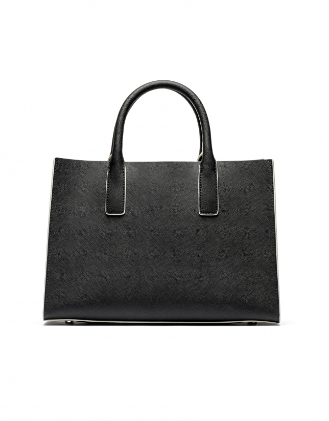 Black Saffiano leather shopping bag, with double handles, removable nylon organizer inside and Chiaro gold embossed logo. Size: 30.5 x 22 x 13 cm.