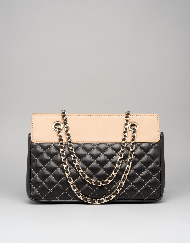 Black quilted cowhide shoulder bag with contrasting seams, leather camel flap with metallic appliqué, Chiaro gold and leather intertwined 110 cm chain and snap. Size: 24 x 16 x 8 cm.