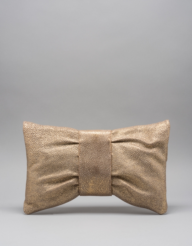 Gold cowhide clutch shaped like a bow, magnetic snap closure, Chiaro gold embossed logo. Size: 29 cm x 17 cm.