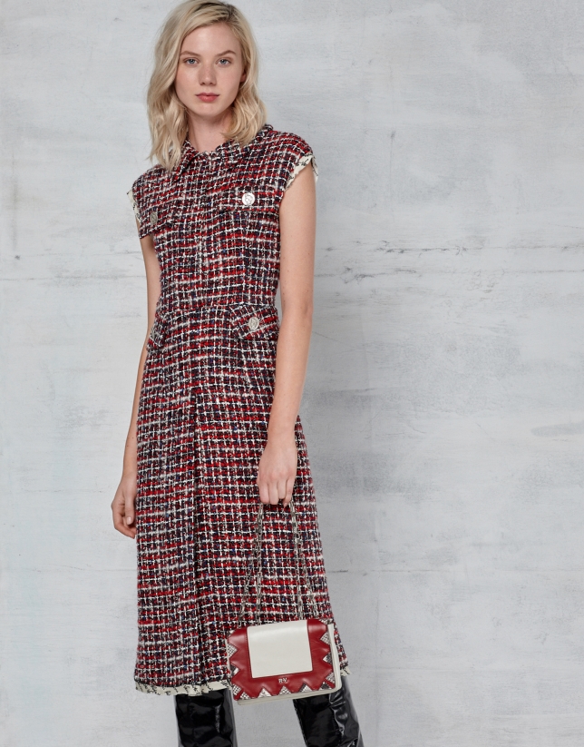 Red and beige patchwork leather animal print shoulder bag with 115 cm chain, flap, inside compartments and lining. Size: 20 X 14 X 5 cms