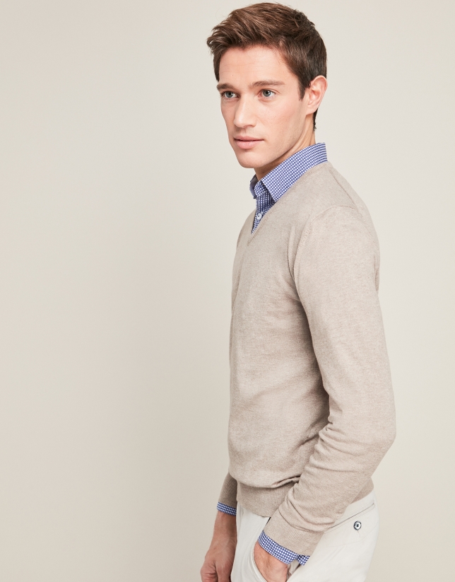 Light taupe cotton V-neck sweater, with straight cut, long sleeves and ribbing on cuffs and hem.