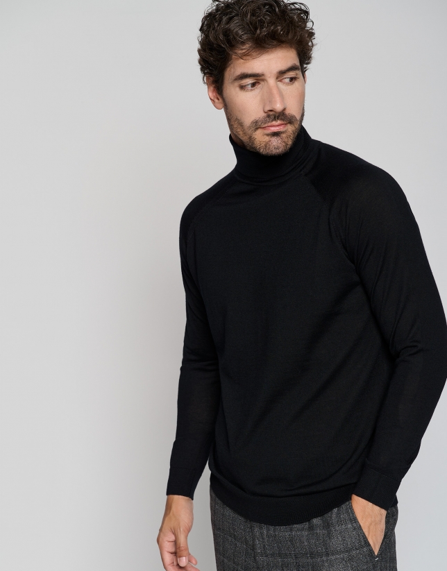 Black melange sweater with turtleneck collar and raglan sleeves. Ribbed finish on collar, cuffs and hem.