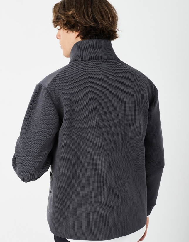 Short windbreaker of gray quilted tech fabric in the front, combined with ribbed knit on collar, sleeves and back. Raised collar, zipper closure with two pulls, two side pockets and one zippered pocket on the chest. Quilted front with yoke and diamond backstitching design.