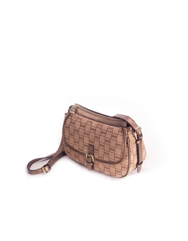 Sand-toast jacquard and metalized cowhide bag with RV print. Zip closure. Exterior pocket. Long adjustable shoulder strap.