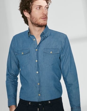 Navy blue, cotton and linen mix pants, with regular cut, tied waist and darts. Two side pockets and two back pockets.
