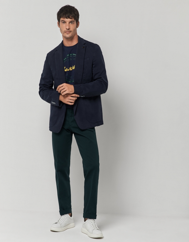 Dark green dyed cotton structure chino pants. French and watch pocket and two flap and buttoned pockets in back.