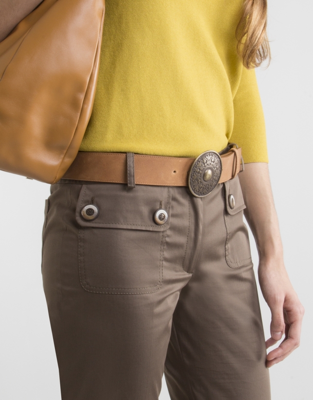 Green straight khaki pants, with front and rear flap pockets, logo button and belt loops.