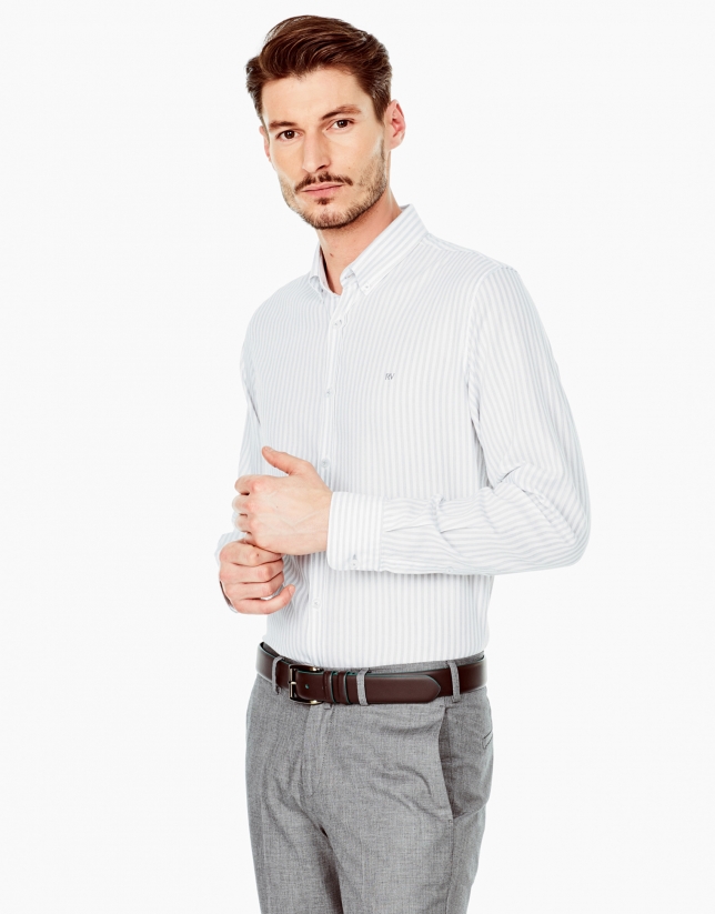 White and gray striped, cotton, regular fit, sport shirt, with V neck with button, front row of buttons, long sleeves with buttoned cuffs and RV embroidered on breast.