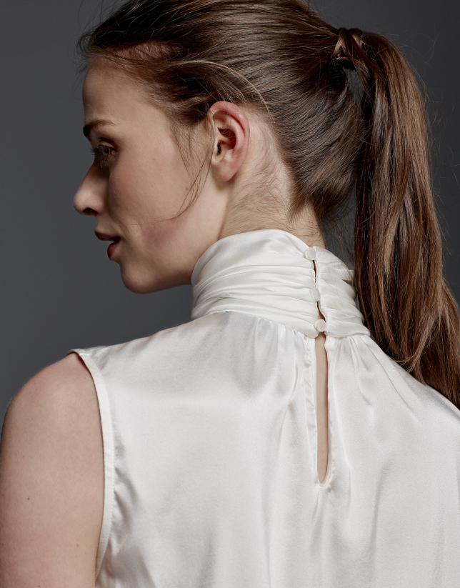 Ivory silk top with high draped collar