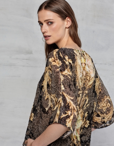 Maroon print, silk/viscose devoré top, with straight cut, boat neck and long sleeves.