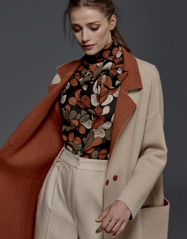 Green and orange retro print, fitted blouse, with flowing fabric, long sleeves and ties at neck.