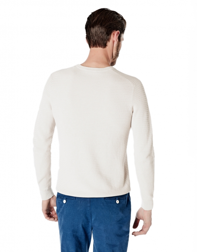 Beige structured, square neck sweater of 100% high twist cotton, with straight cut, long sleeves and ribbing on cuffs and hem.