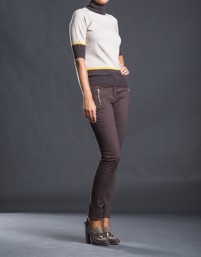 Jersey beige de manga corta al codo. Cuello cisne y elásticos en contraste fantasía.