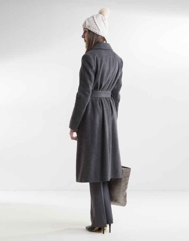 Abrigo de mujer gris con cuello camisero, botones y cinturón