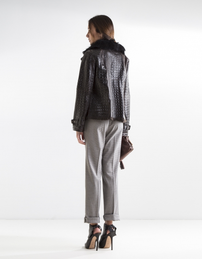 Cazadora de mujer en conejo grabado coco marrón oscuro. Interior de pelo, cuello pelo cordero toscana, dos bolsillos laterales y cierre con cremallera.