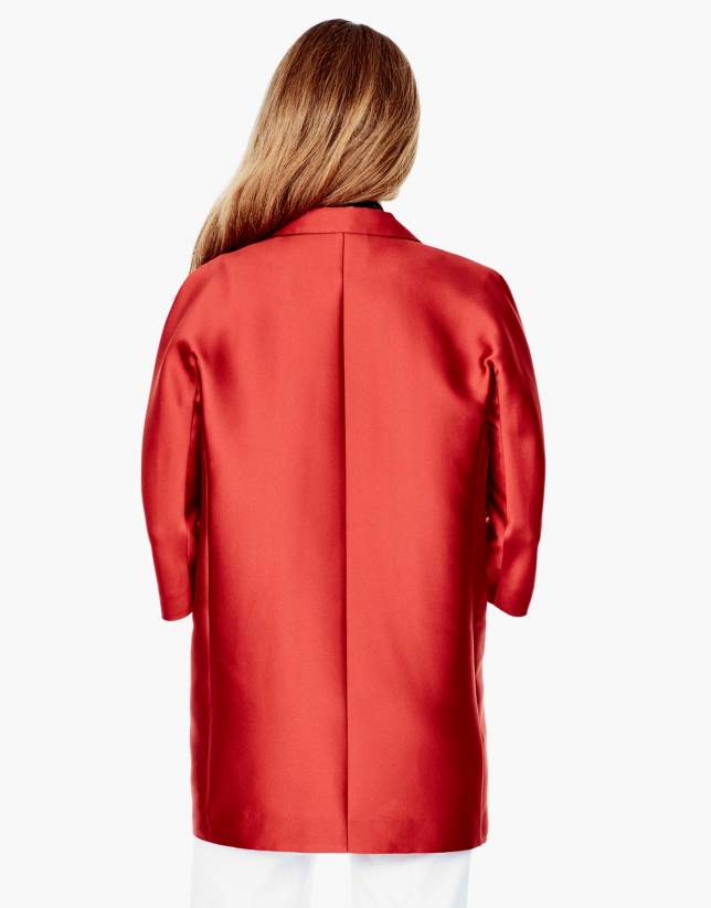 Abrigo corto naranja, corte recto, cuello solapa, manga 7/8, bolsillos laterales en costura y cierre frontal con dos broches ocultos.