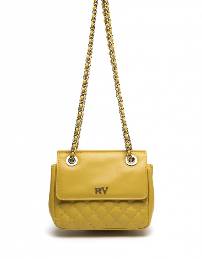 Bolso shoulder mini en piel vacuno acolchada amarilla con tapeta en piel lisa, asa de cadena en oro chiaro combinada con piel entrelazada de 110 cm, logo metálico RV en oro chiaro y cierre con broche. Medidas 11 cm x 16 cm x 7 cm.