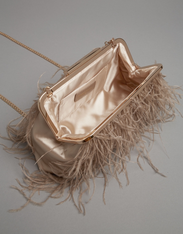 Bolso clutch fabricado con plumas de avestruz en color natural con metálicas en oro claro. Cadena extraíble, cierre a presión personalizado e interior de tejido. Medidas: 21,5 x 14,5 x 6 cm. Cadena extraíble: 119 cm