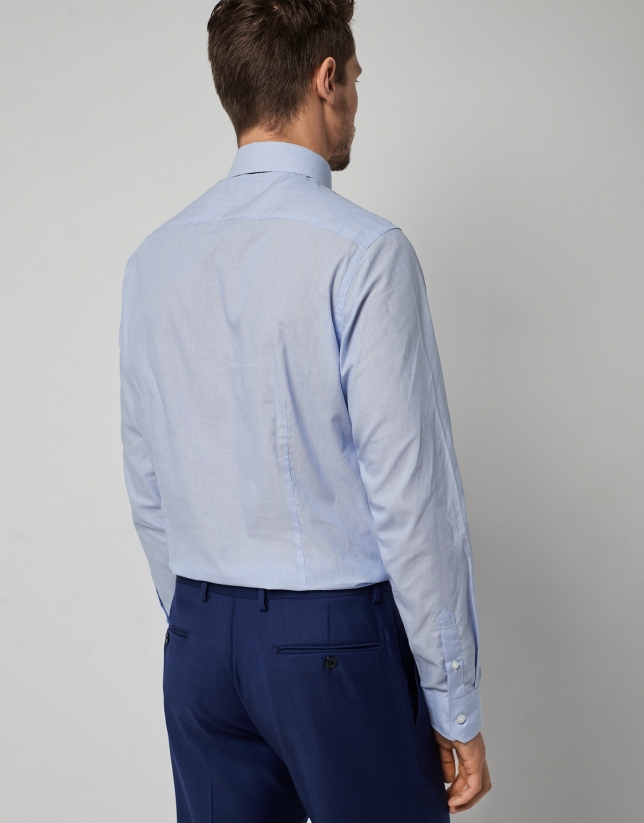 Camisa de vestir regular fit en algodón milrayas color celeste. Cuello italiano, cierre mediante botonadura frontal y manga larga terminada en puño abotonado.