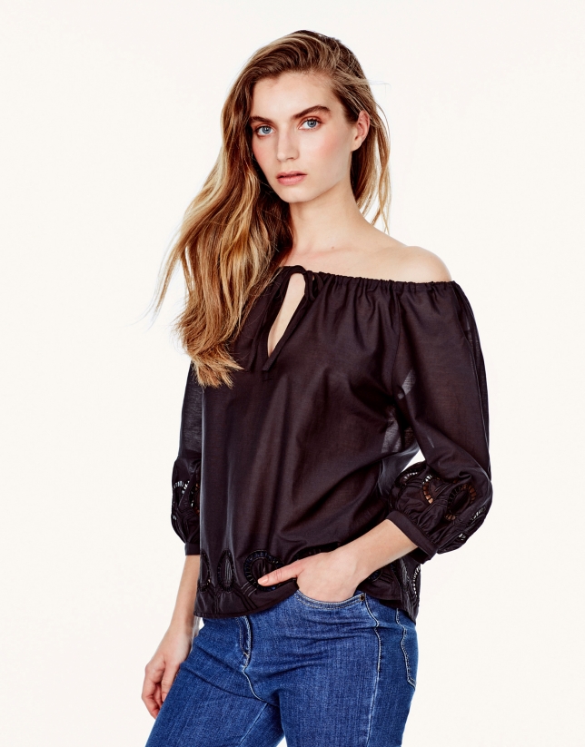 Blusón negro de corte recto con detalle de bordado en bajo y puños, escote bardot elástico con lazo de cierre y manga 7/8.