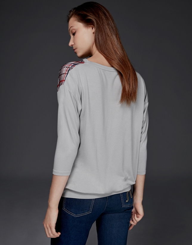 Camiseta de manga murciélago y cuello barco confeccionada en tejido estampado de cuadros grises en frontal y liso en el resto. Cuerpo fluido rematado en cintura ajustada de canalé.