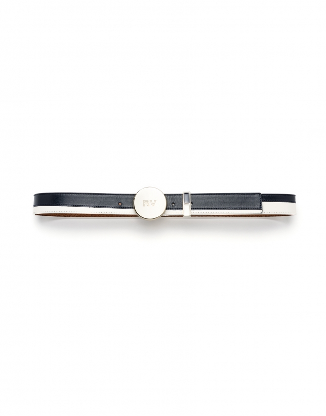 Cinturón confeccionado en piel vacuno lisa bicolor azul/blanco, hebilla metálica en oro chiaro con logo RV grabado. Ancho 3 cm.