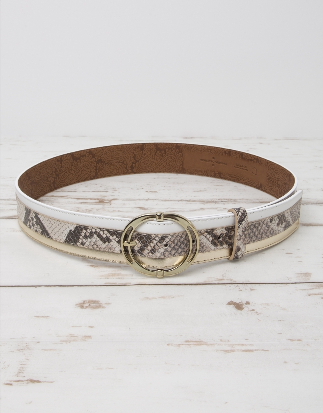 Cinturón de mujer en piel vacuno combinado con fantasía serpiente. Hebilla en oro chiaro. Ancho de 4cm.