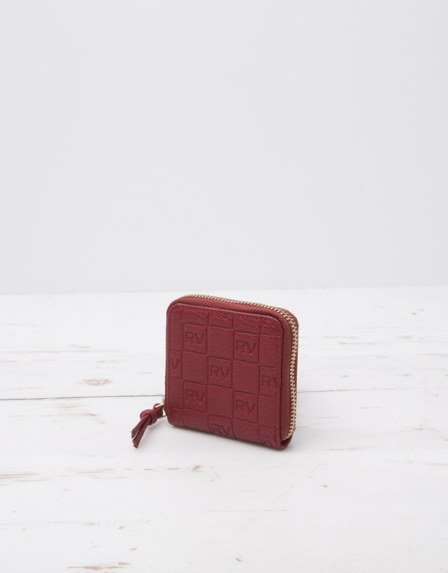 Monedero de mujer en piel vacuno rojo, personalizado con grabado de logos RV, cierre con cremallera. Medidas 8 x 8 cm.