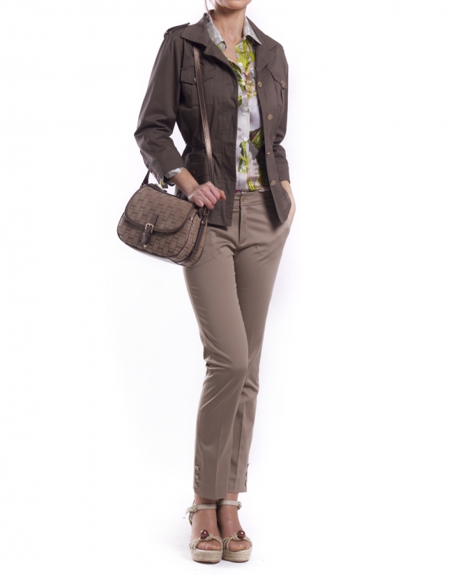 Bolso en tejido jaquard RV arena-tostado y piel vacuno metalizada. Cierre cremallera. Bolsillo exterior. Asa bandolera regulable.