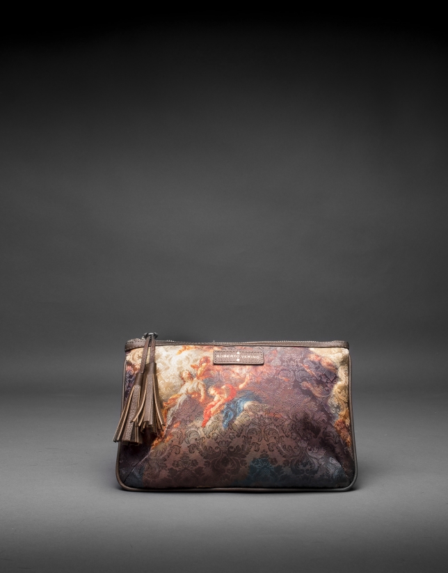 Clutch dos caras con jaquard escena barroca y corcho grabado serpiente laminado. Combinado en piel vacuno. Cierre cremallera.