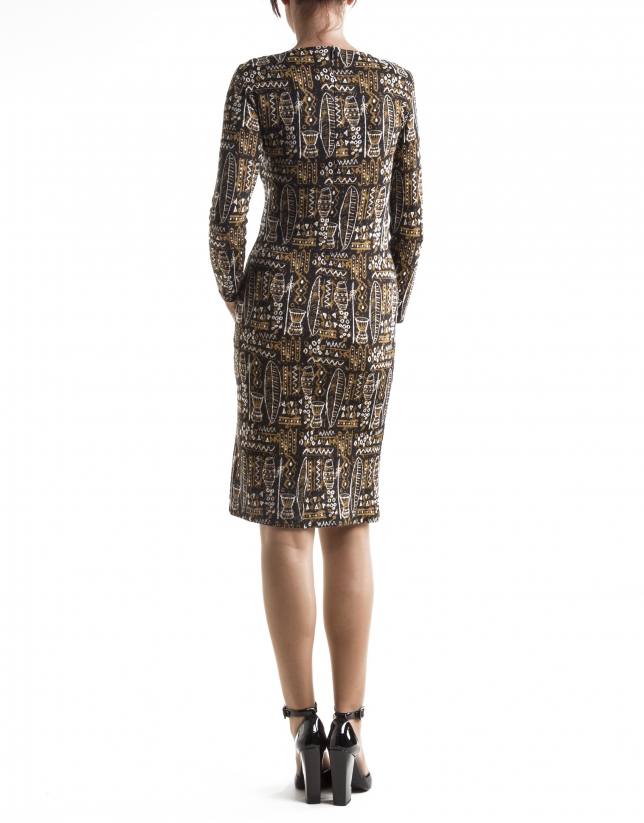 Vestido de manga larga y cuello pico. Tejido con estampado africano en tonos amarillos y marrones. Cierre con cremallera invisible en centro espalda. Lleva forro.
