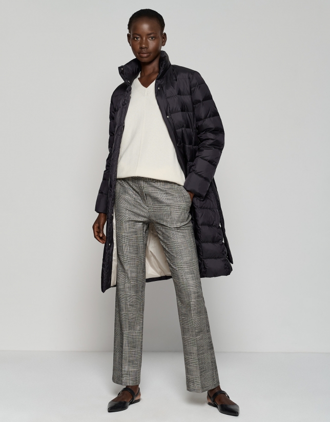 Plumífero largo con acolchado cosido en horizontal color negro e interior a contraste en color beige. Cuello subido, cierre con cremallera y broches ocultos bajo tapeta y cinturón de atar. Dos bolsillos laterales insertados en costura.