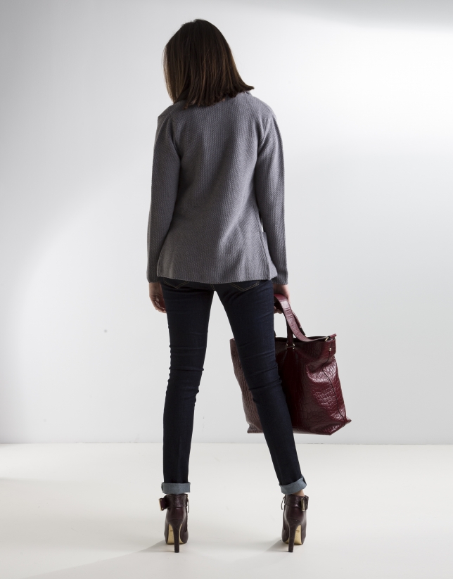 Chaqueta punto gris de mujer, de corte recto, manga larga, cuello camisero, dos bolsillos de parche en delantero y cierre frontal con botones a tono