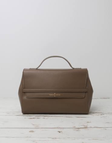 Jersey de mujer en punto camel, corte recto con aberturas laterales, manga tres cuartos y cuello barco.