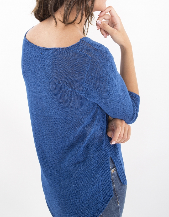 Jersey de punto fino azul con corte fluido, cuello pico, manga 7/8, aberturas laterales y bajo ligeramente redondeado.